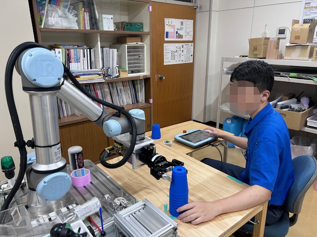 昨年まではPLCを使った実習でしたが、今年は協働ロボットを使った実習を行いました。